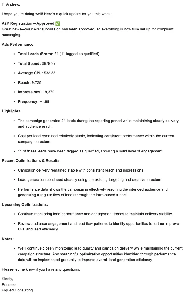 Check out the example we sent to Andrew only a month into his campaign.